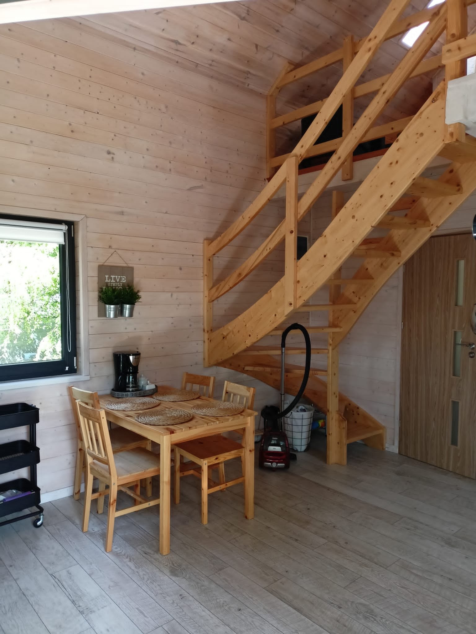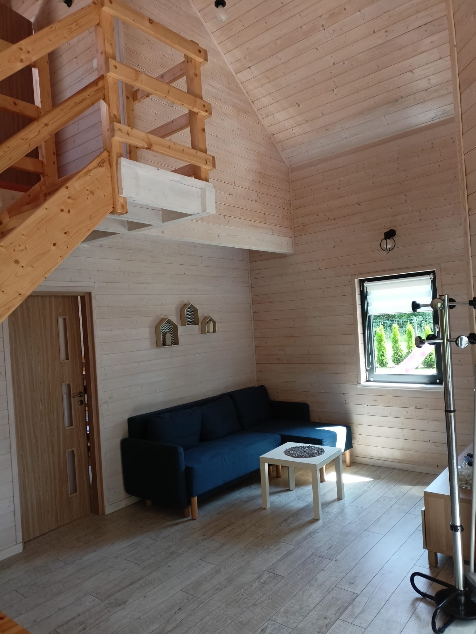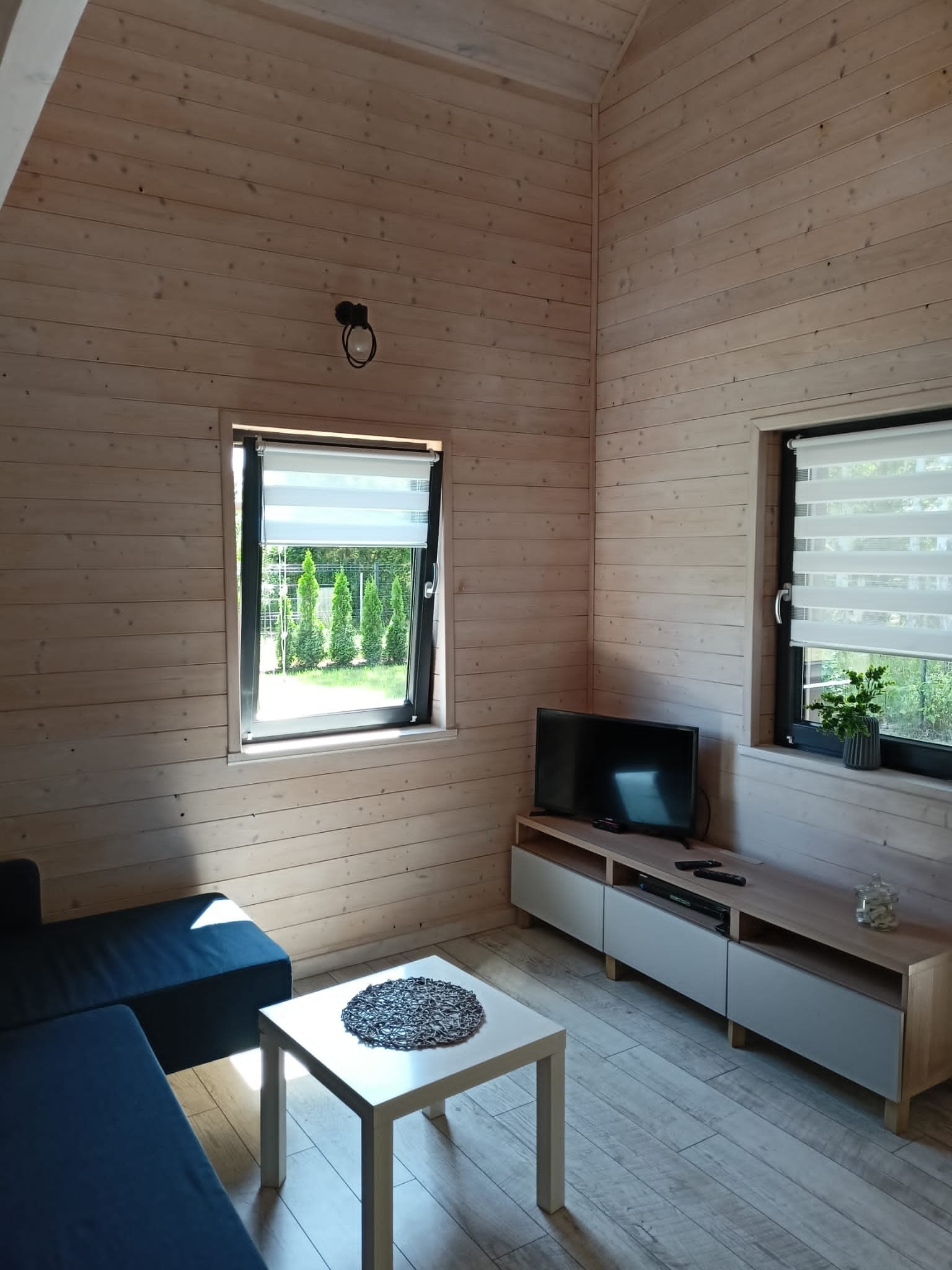 Na parterze znajduje się salon z telewizorem, kanapą oraz aneksem kuchennym w pełni wyposażonym między innymi w lodówkę, kuchenkę indukcyjną, czajnik, garnki, sztućce, zmywarka. Sypialnia dwu osobowa z oddzielnymi łóżkami 80cm na 200cm. Łazienka z prysznicem umywalką, WC, i pralką automatyczną.