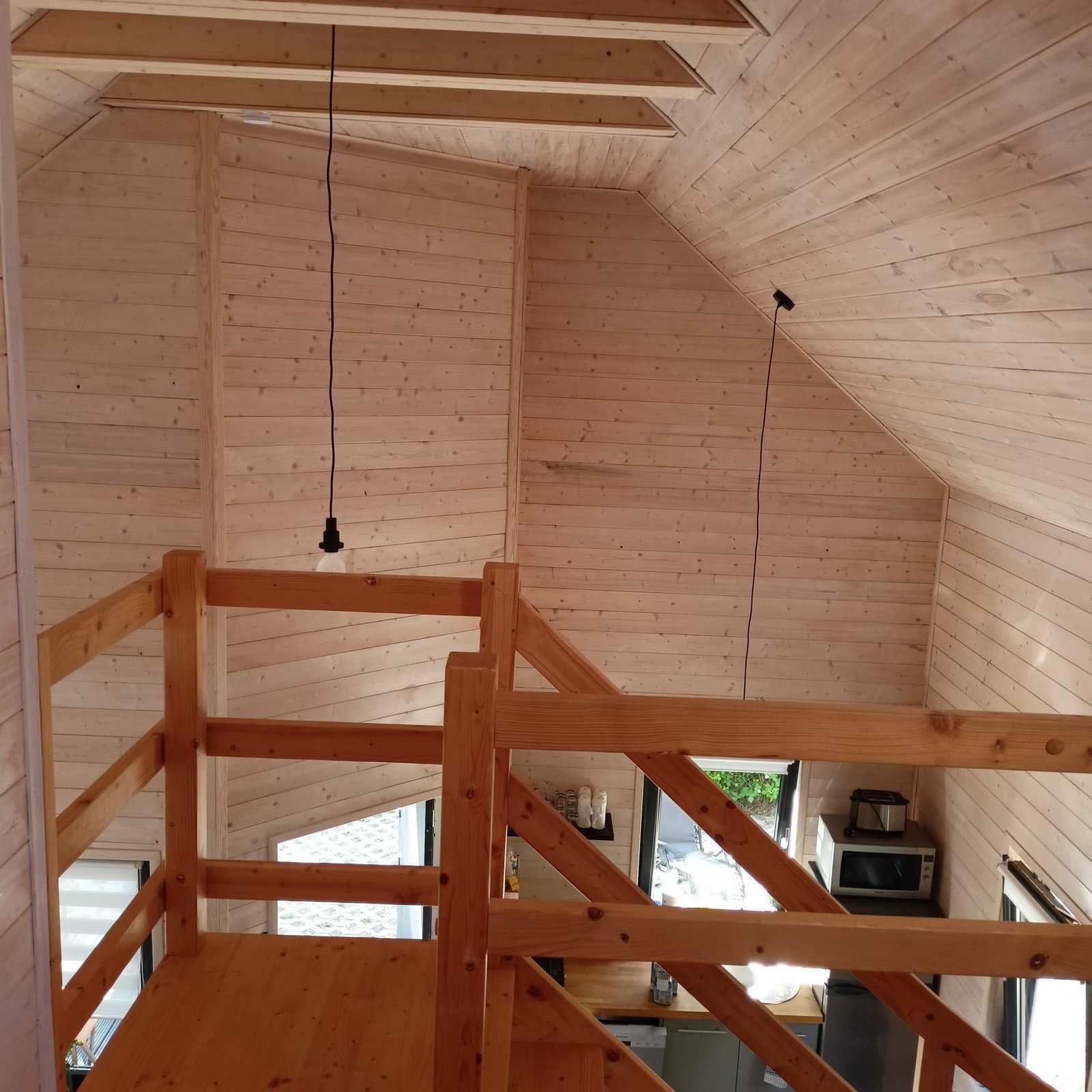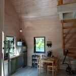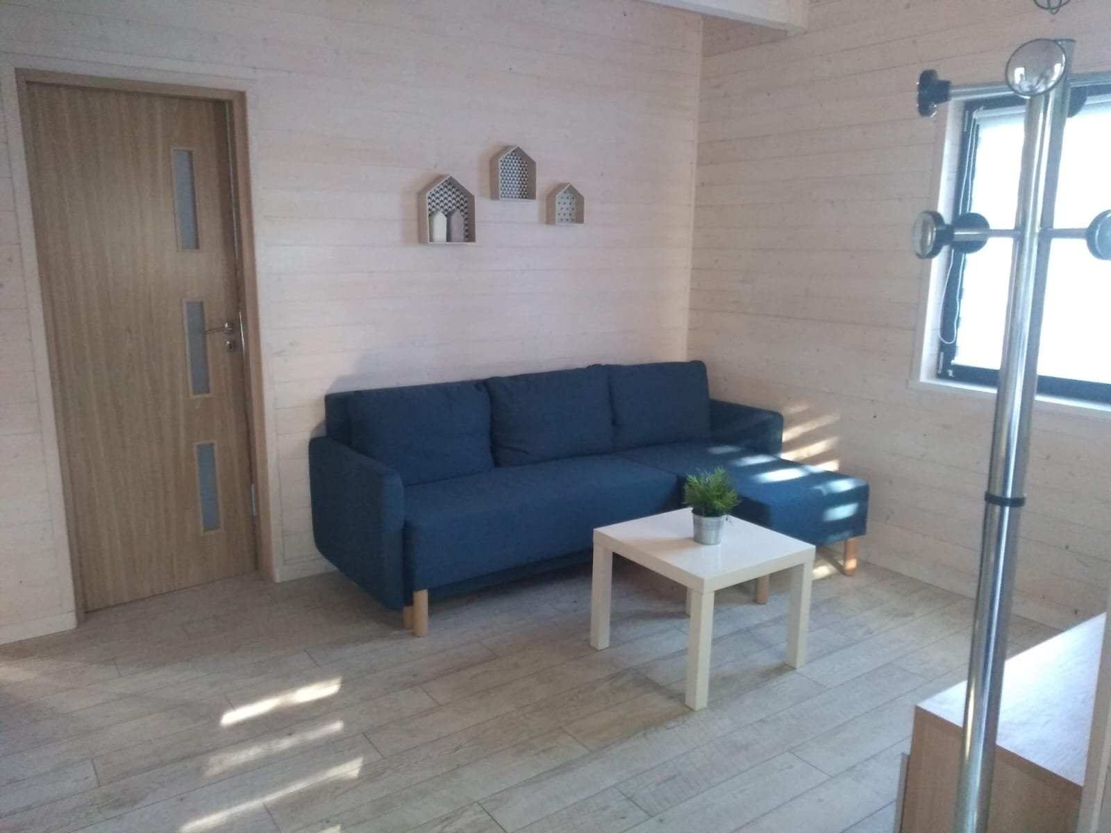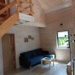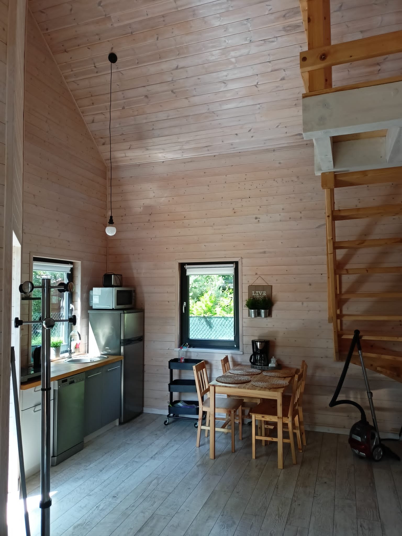 Na parterze znajduje się salon z telewizorem, kanapą oraz aneksem kuchennym w pełni wyposażonym między innymi w lodówkę, kuchenkę indukcyjną, czajnik, garnki, sztućce, zmywarka. Sypialnia dwu osobowa z oddzielnymi łóżkami 80cm na 200cm. Łazienka z prysznicem umywalką, WC, i pralką automatyczną.