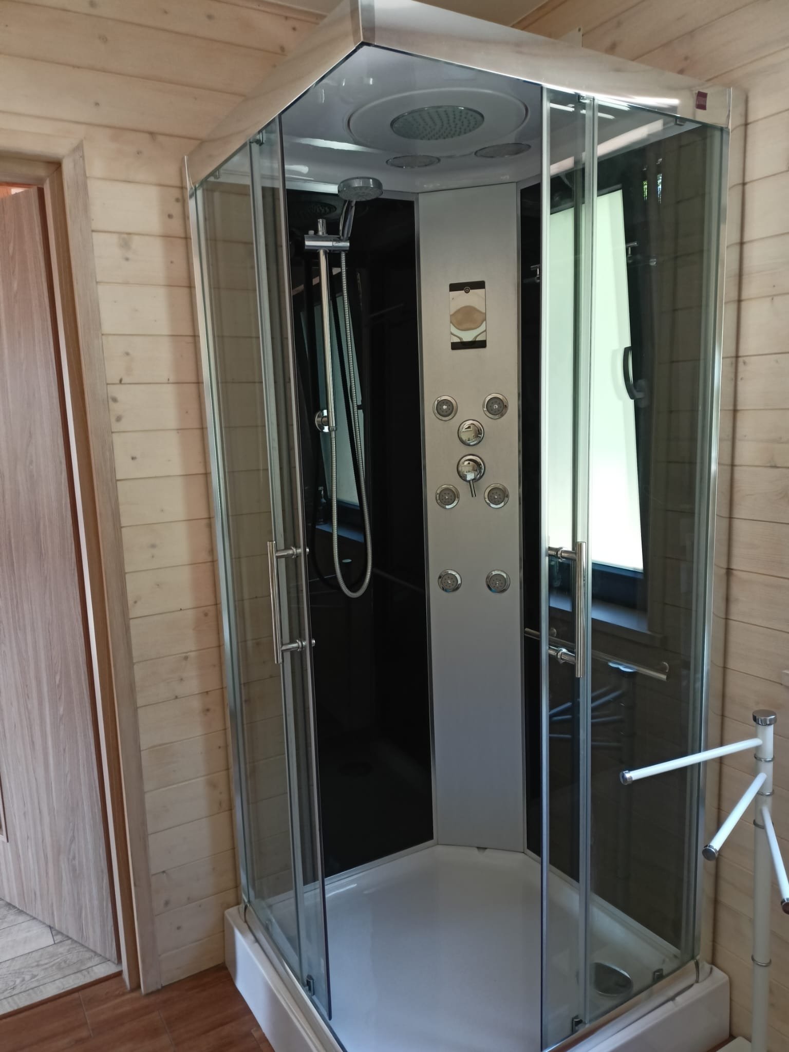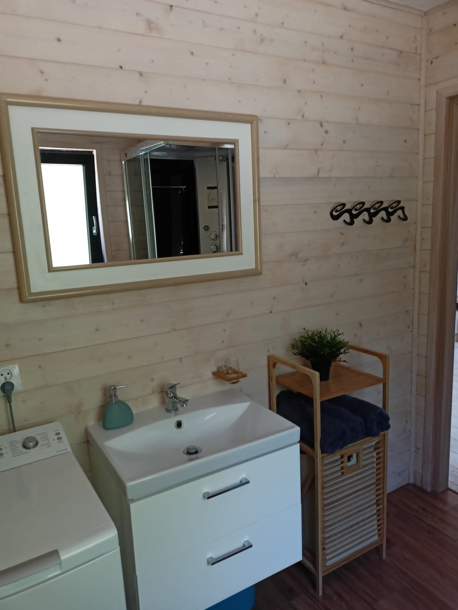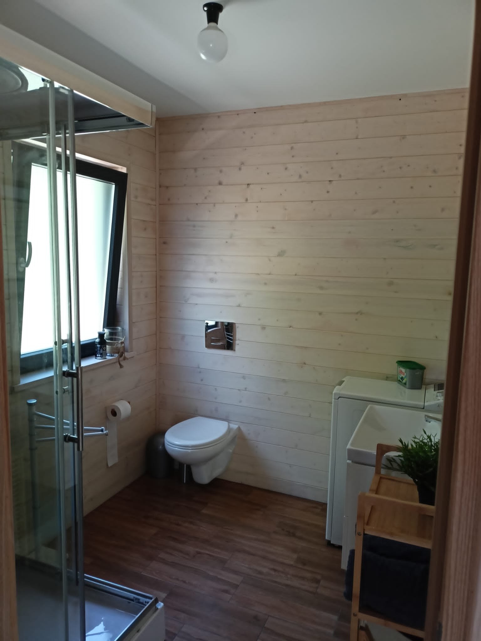 Na parterze znajduje się salon z telewizorem, kanapą oraz aneksem kuchennym w pełni wyposażonym między innymi w lodówkę, kuchenkę indukcyjną, czajnik, garnki, sztućce, ekspress do kawy, zmywarka. Sypialnia dwu osobowa z oddzielnymi łóżkami 80cm na 200cm. Łazienka z prysznicem umywalką, WC, i pralką automatyczną.